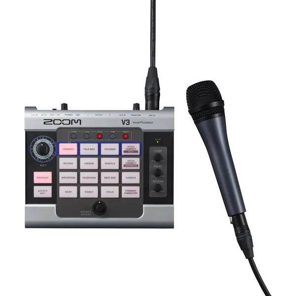 Make your vocal sound shine for your next livestream, home recording, or onstage performance with the Zoom V3, a vocal processor teeming with exciting effects and easy-to-use controls. You'll never have to enter a menu to access the V3's powerful functions thanks to the large, clearly-labeled knobs and illuminated buttons, letting your focus remain on being creative and entertaining.